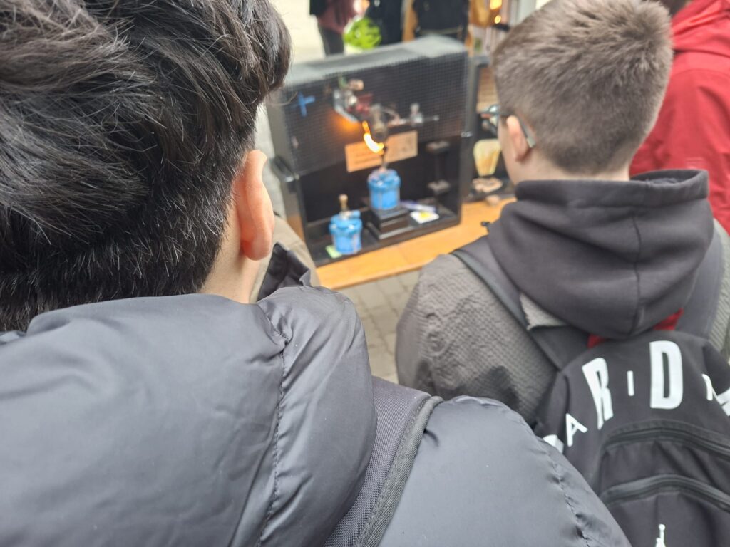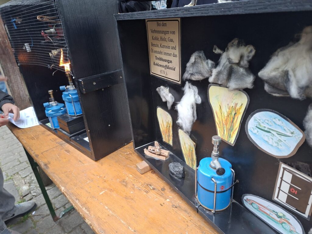 Dann begann der ernsthafte Teil des Programmes. Die Schüler*innen probierten sich durch viele Stationen und konnten so viel über alternative Stromerzeugung und die Funktionsweise von Kraftwerken ausprobieren. Es gab ein Fahrrad, mit dem man entweder eine Modellbahn antreiben, oder Wasser zum Kochen bringen sollte. Bisher war das noch nicht gelungen, dementsprechend groß war der Ehrgeiz. Aber die Zeit war begrenzt, doch immerhin konnte das Wasser war von 15°C auf 68°C gebracht werden. Eine reife Leistung der Gruppe!