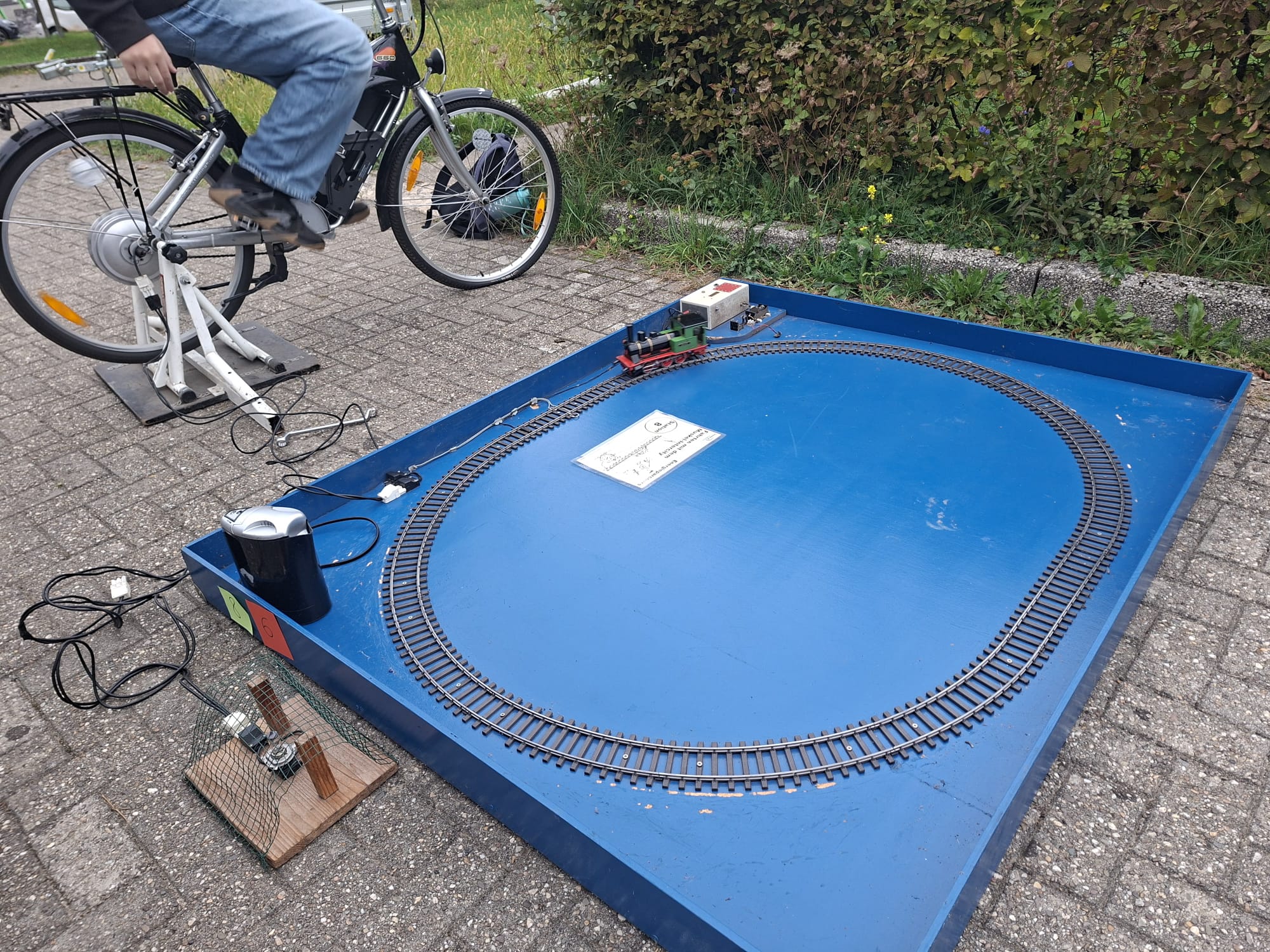 Dann begann der ernsthafte Teil des Programmes. Die Schüler*innen probierten sich durch viele Stationen und konnten so viel über alternative Stromerzeugung und die Funktionsweise von Kraftwerken ausprobieren. Es gab ein Fahrrad, mit dem man entweder eine Modellbahn antreiben, oder Wasser zum Kochen bringen sollte. Bisher war das noch nicht gelungen, dementsprechend groß war der Ehrgeiz. Aber die Zeit war begrenzt, doch immerhin konnte das Wasser war von 15°C auf 68°C gebracht werden. Eine reife Leistung der Gruppe!