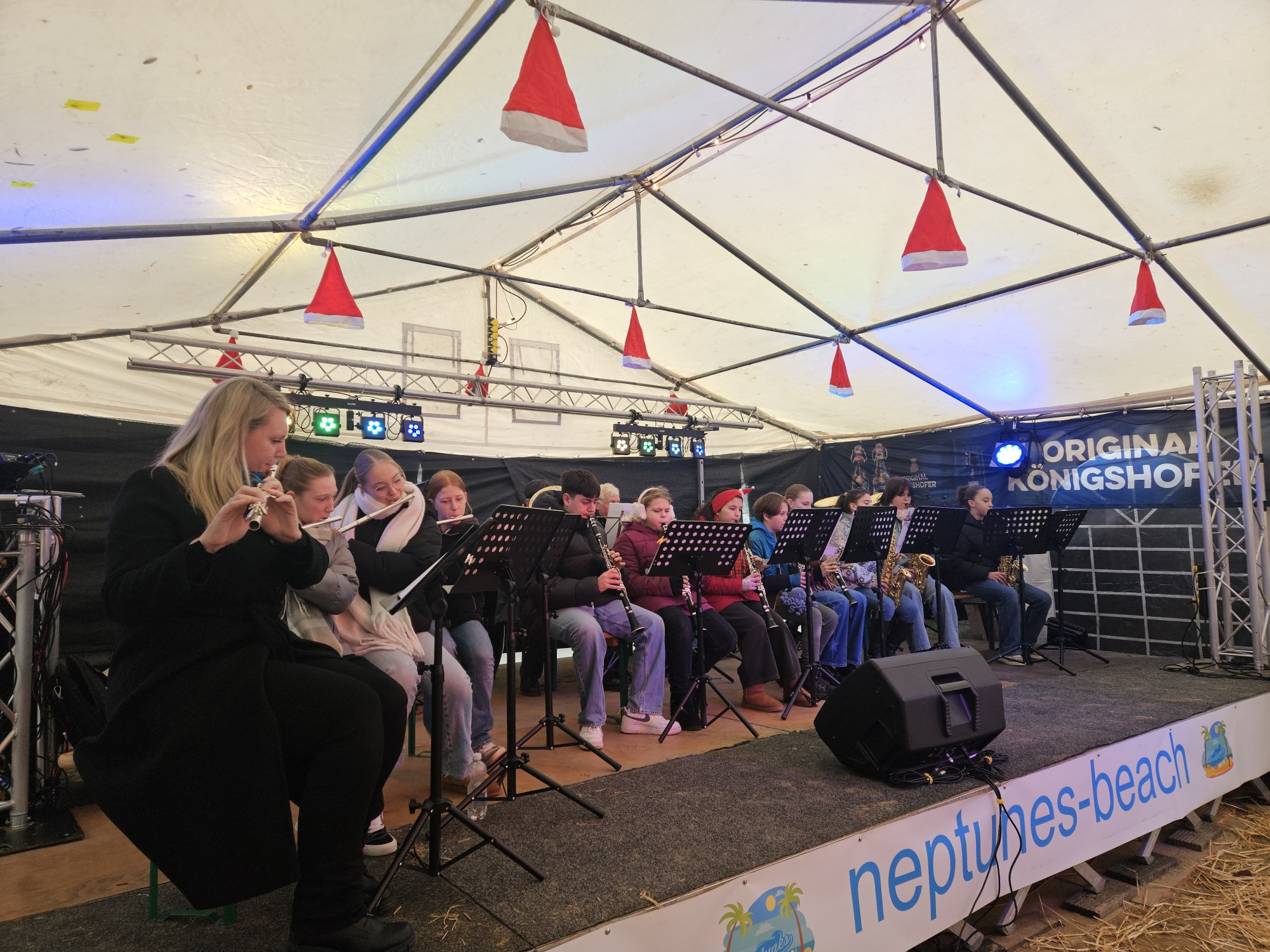 Die Musik AG trat am heutigen ersten Advent auf dem Weihnachtsmarkt des Neptuner Sommerbads auf. Bei gutem Wetter kamen zahlreiche Besucher und bei Klassikern wie Rudolph, the Red-Nosed Reindeer, O Tannenbaum, Gloria in excelsis Deo kam auch schöne Weihnachtsstimmung auf. Die Zuschauer entlockten der Musik AG zum Schluss noch eine Zugabe, bevor sie mit reichlich Applaus verabschiedet wurden.