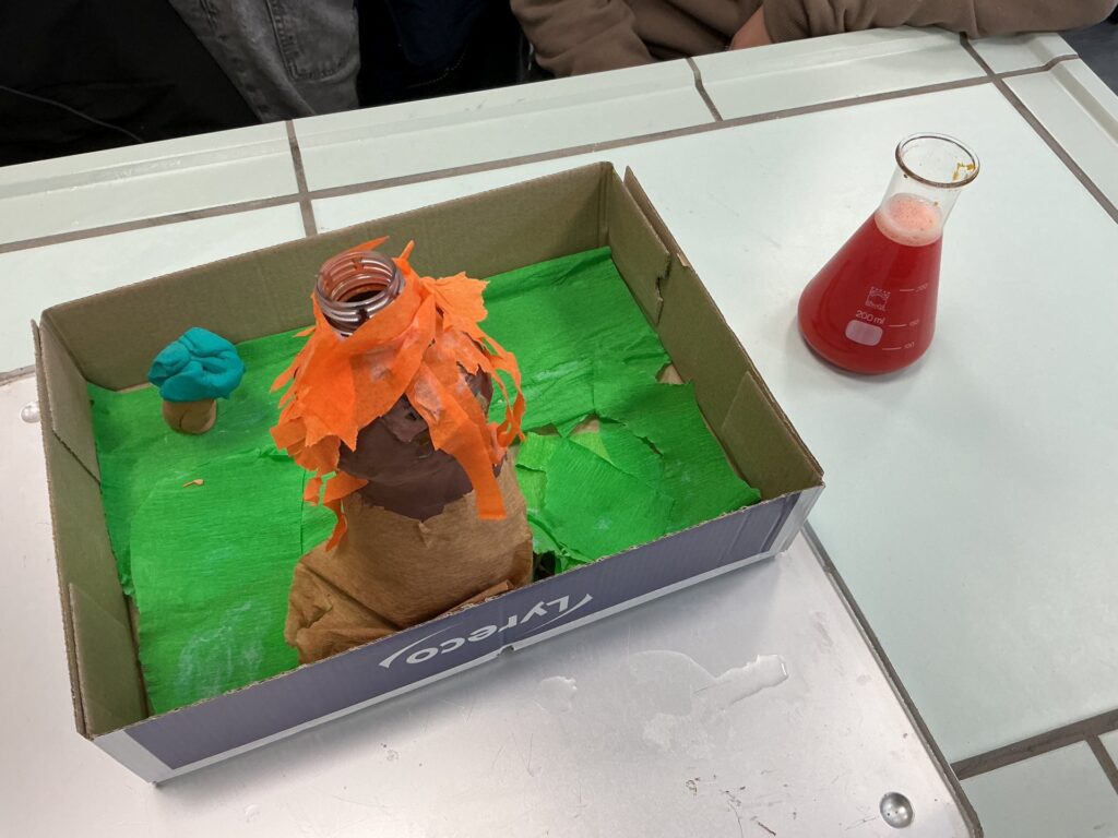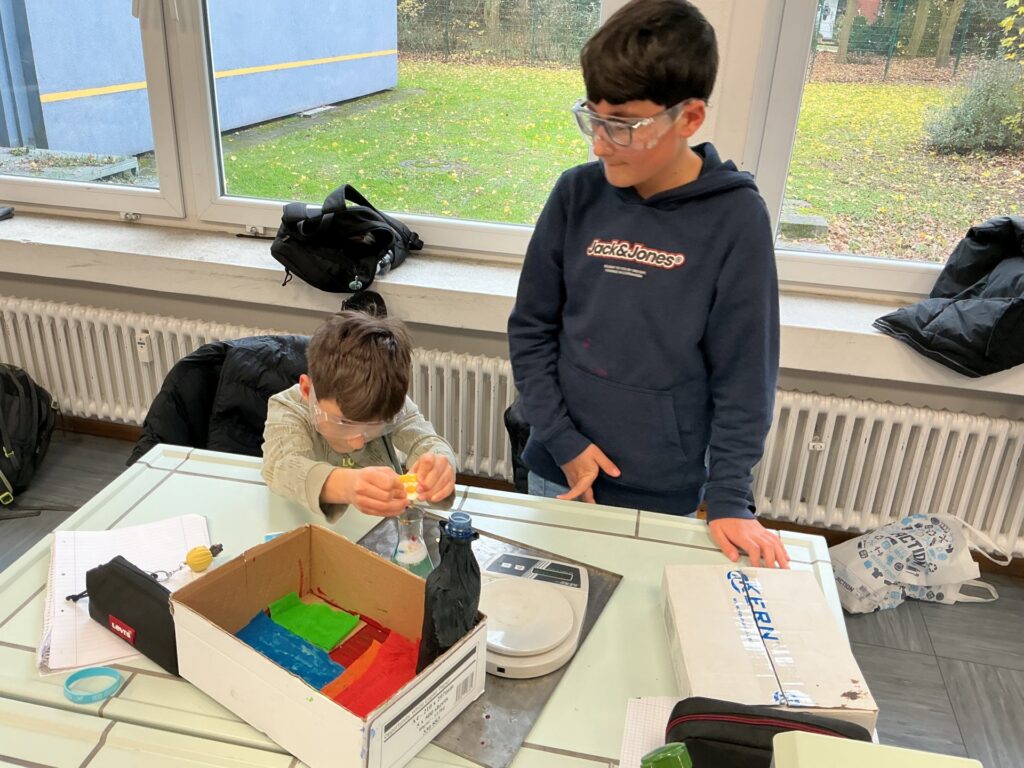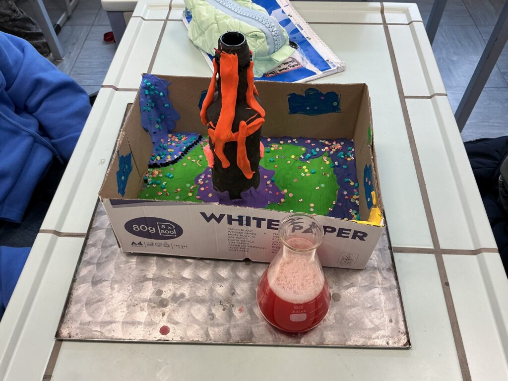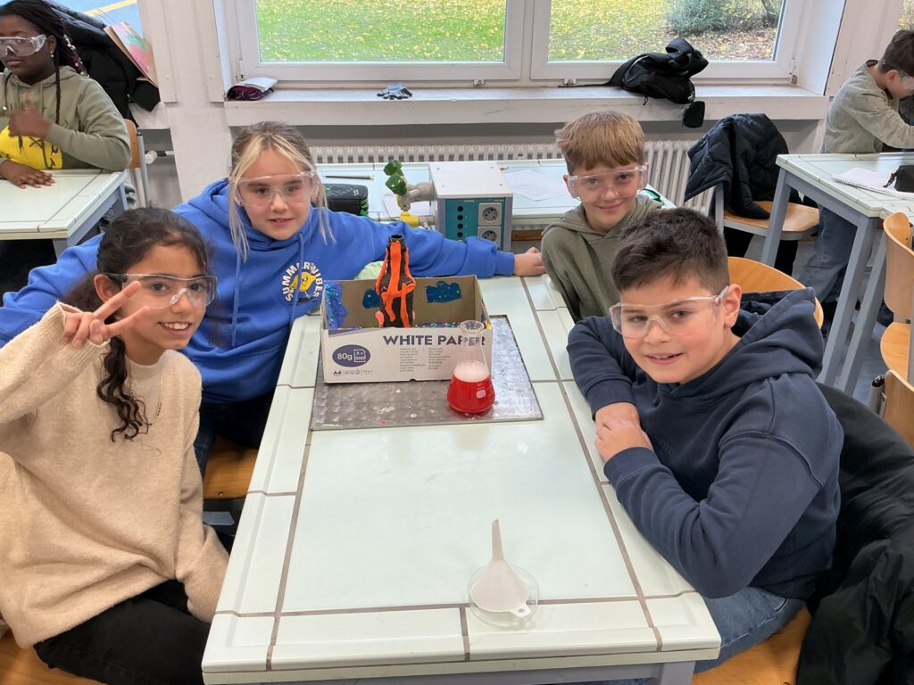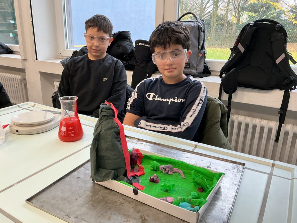 In den vergangenen Wochen stand für die Klasse 5e im MINT-Unterricht das praktische Arbeiten im Mittelpunkt. Die Schülerinnen und Schüler bauten eigene Vulkanmodelle aus Flaschen, Pappe, Knete und Bastelpapier und bereiteten damit ein spannendes Experiment vor. Im Anschluss wurde mithilfe einer chemischen Reaktion aus Zitronensäure, Backpulver und Wasser ein „Vulkanausbruch“ ausgelöst. Die Kinder konnten dabei genau beobachten, wie durch das Mischen verschiedener Stoffe Gase entstehen und sich das Reaktionsgemisch sichtbar verändert. Besonders im Vordergrund standen das selbstständige Experimentieren, das genaue Beobachten sowie erste Schritte im wissenschaftlichen Arbeiten wie das Vermuten, Überprüfen und Auswerten. Mit großer Motivation und Begeisterung waren alle bei der Sache. Das Projekt zeigte eindrucksvoll, wie anschaulich Naturwissenschaften im MINT-Unterricht erlebbar werden können.